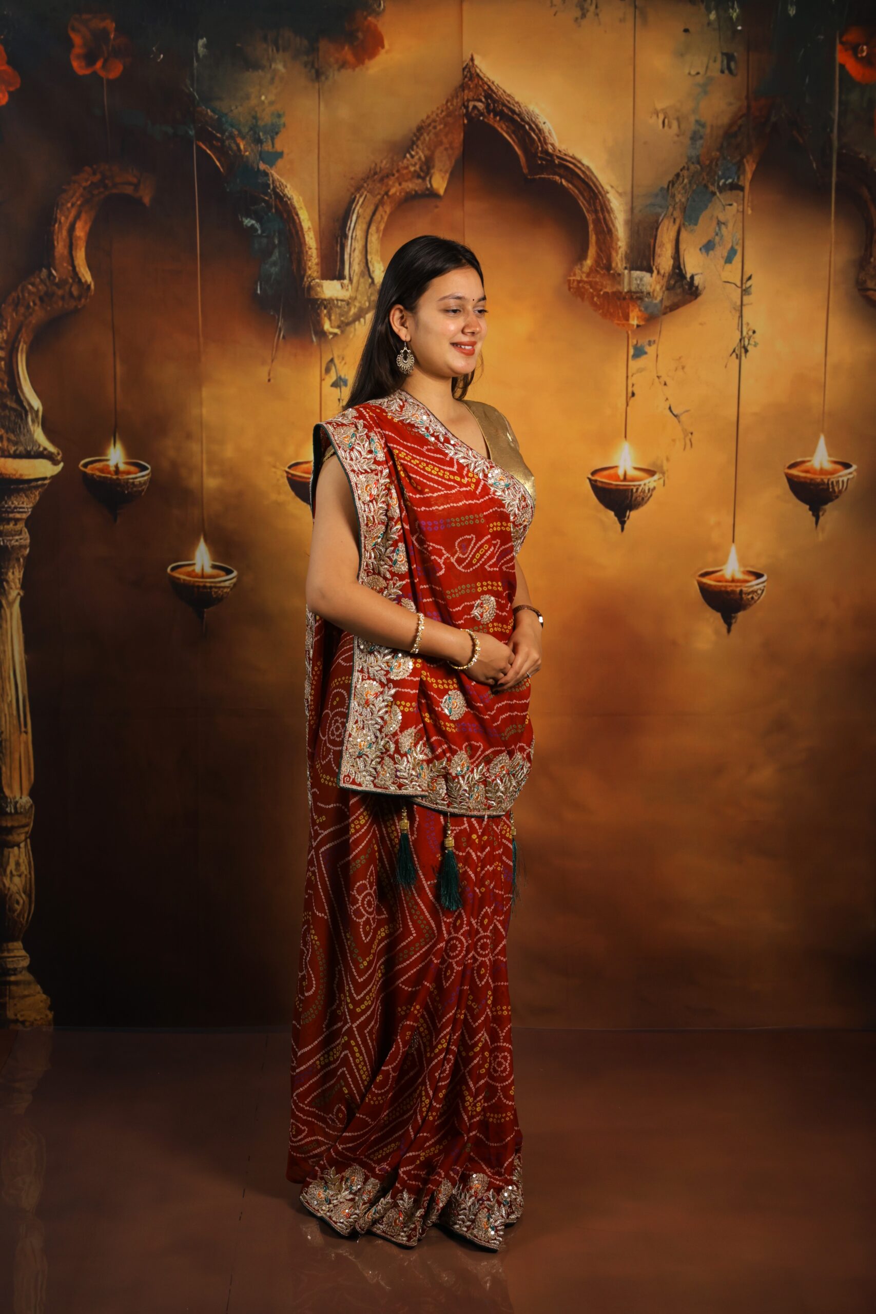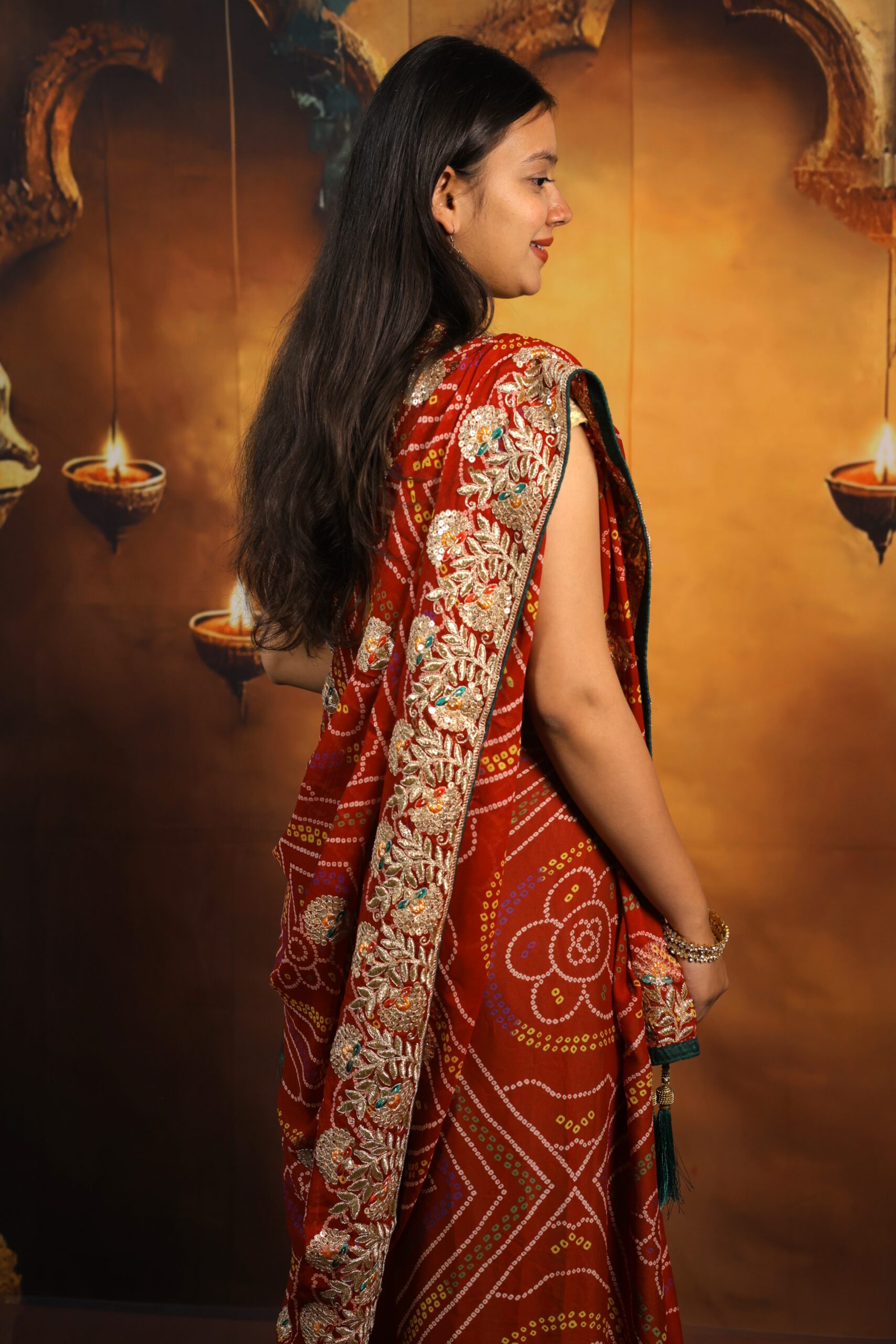 The Gaji Silk Bandhej Saree celebrates the traditional tie-dye heritage of Rajasthan with premium craftsmanship. The glossy and smooth Gaji silk fabric offers a luxurious drape, while authentic Bandhej patterns add vibrant cultural beauty. Mirrorwork highlights enhance its festive appeal, making it a stunning pick for traditional functions and ethnic styling.
