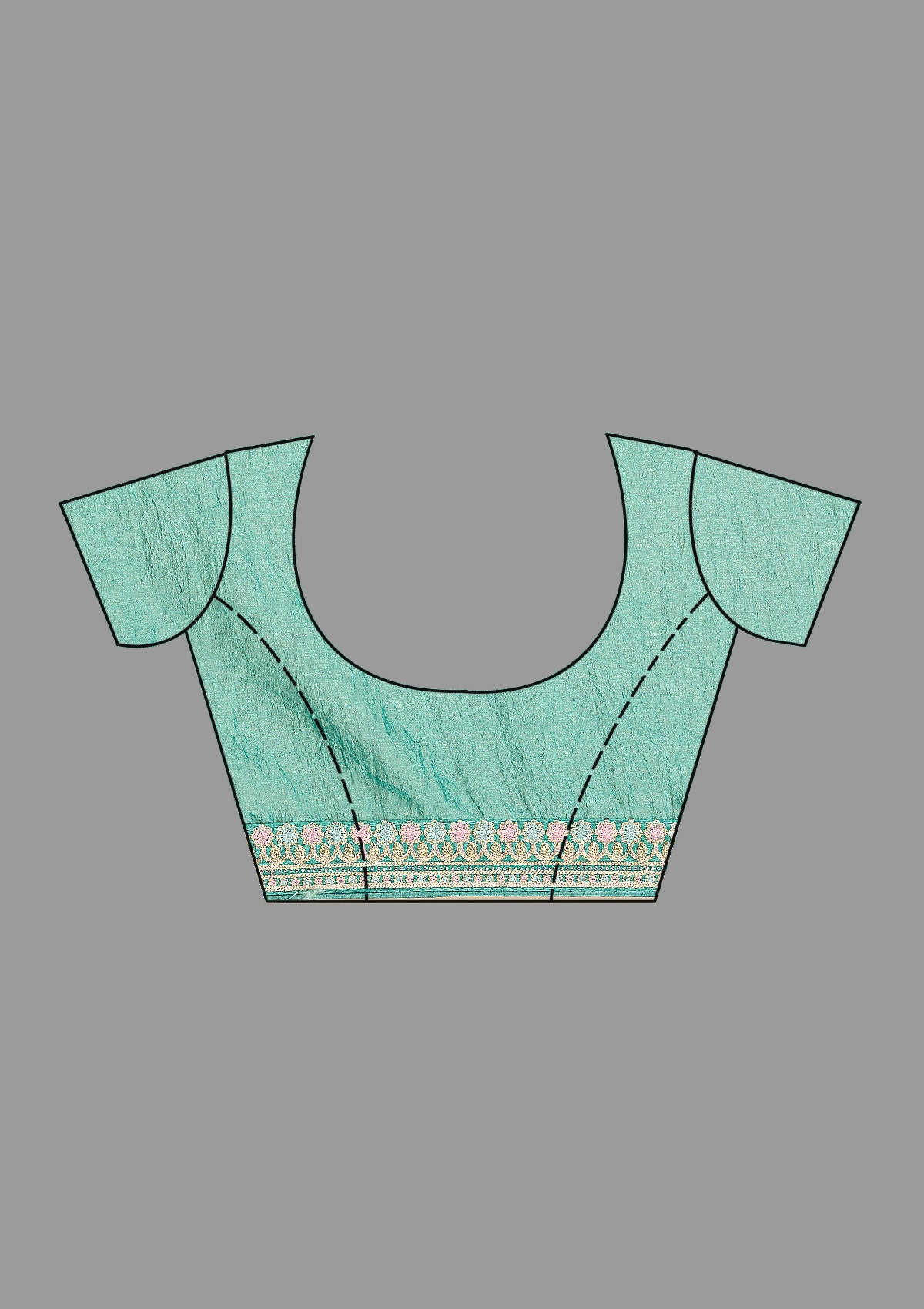 Radiate charm and sophistication at your next evening event in Green Soft Raw Silk Saree, adorned with exquisite Gold Zariwork. Each fold of the saree catches the light with a playful shimmer, offering a visual feast of vibrant energy and lush fabric. Perfect for those who wish to embody elegance with a spirited flair, this saree promises a dazzling presence.