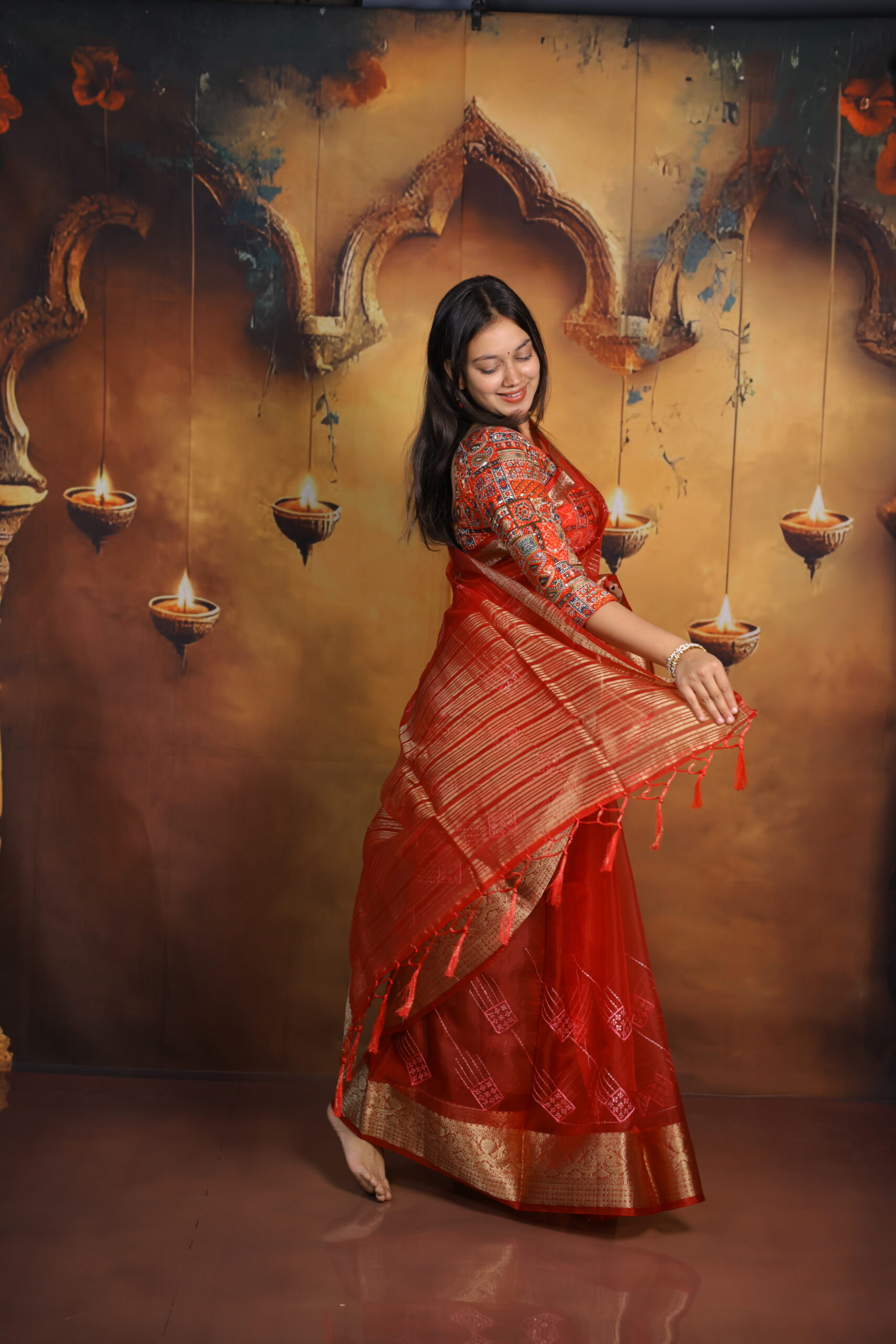 This Red Banarasi Organza Saree is crafted to radiate sophistication with its lightweight yet rich texture. The organza fabric enhances every pleat with a graceful structure, while the intricate Banarasi weaving adds a touch of royal charm. The lustrous pallu and detailed borders give this saree a timeless festive appeal.